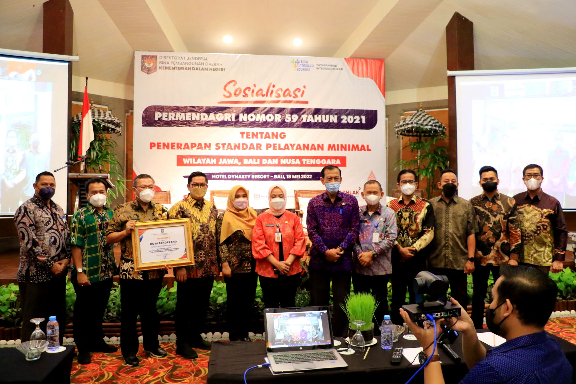 Penghargaan diberikan Sekretaris Ditjen Bina Pembangunan Daerah Sri Purwaningsih, kepada Pemerintah Kota Tangerang dalam acara Sosialisasi Permendagri Nomor 59 Tahun 2021 tentang Penerapan Standar Pelayanan Minimal Wilayah Jawa, Bali dan Nusa Tenggara di Hotel Dynasti Rsort, Kuta, Bali